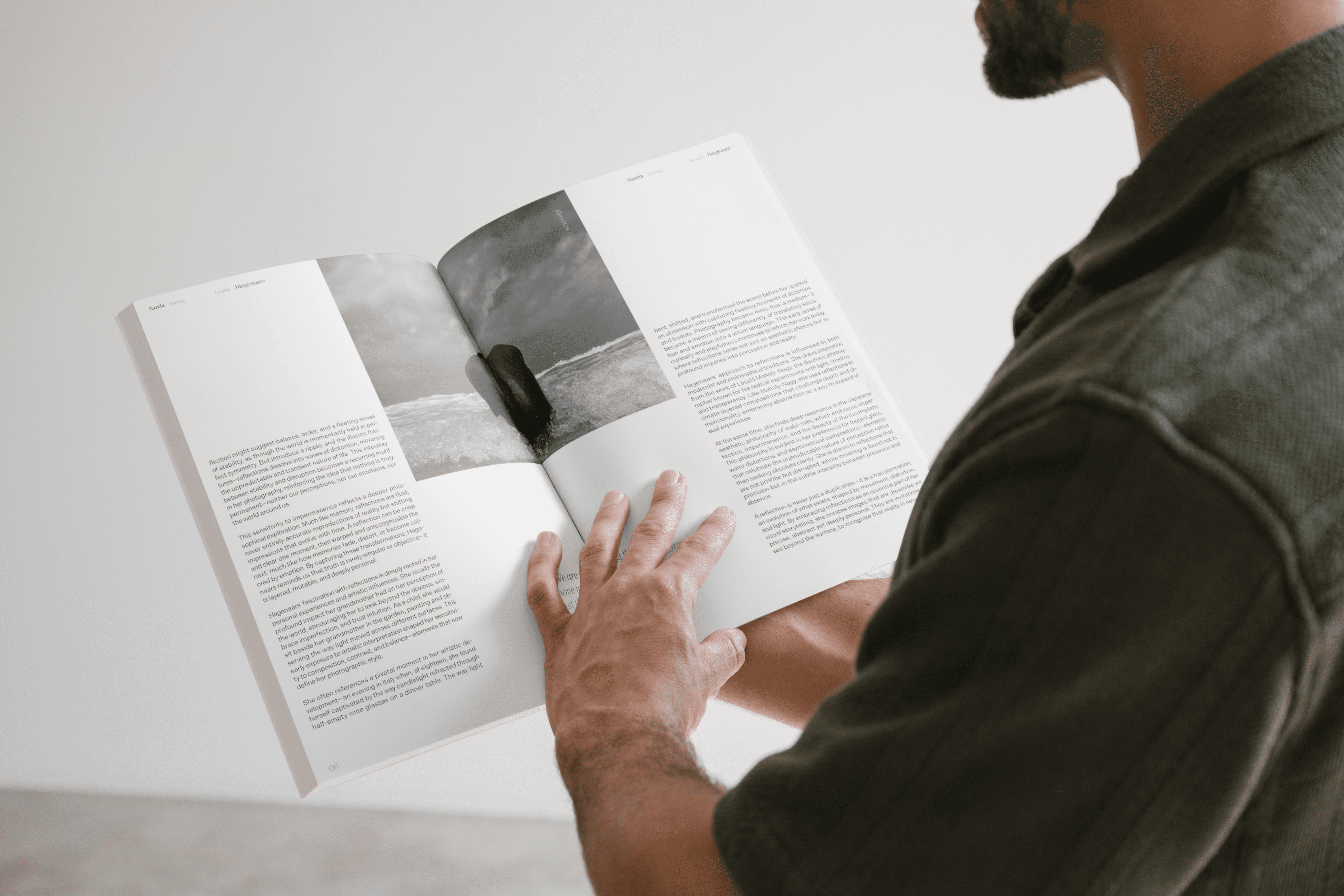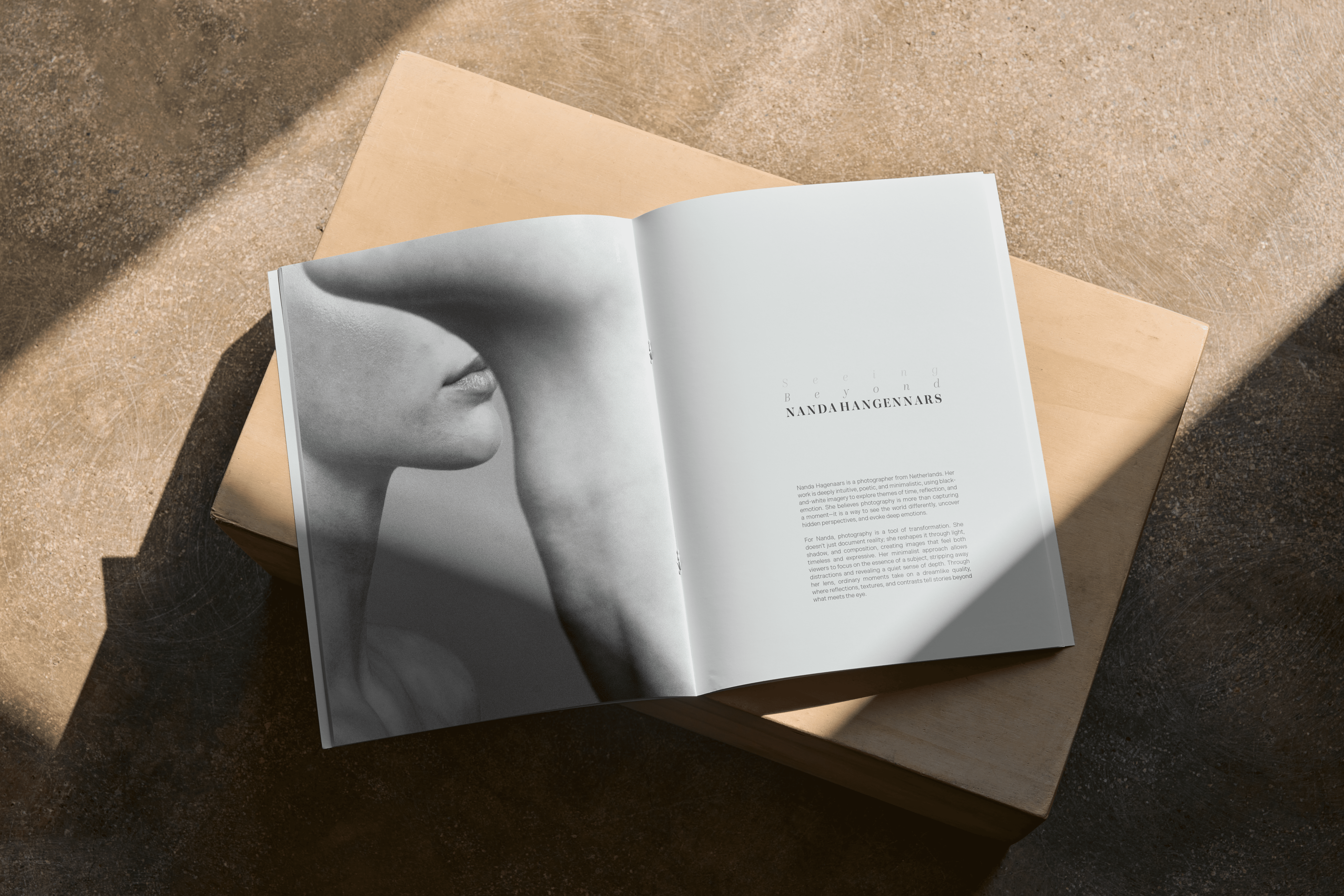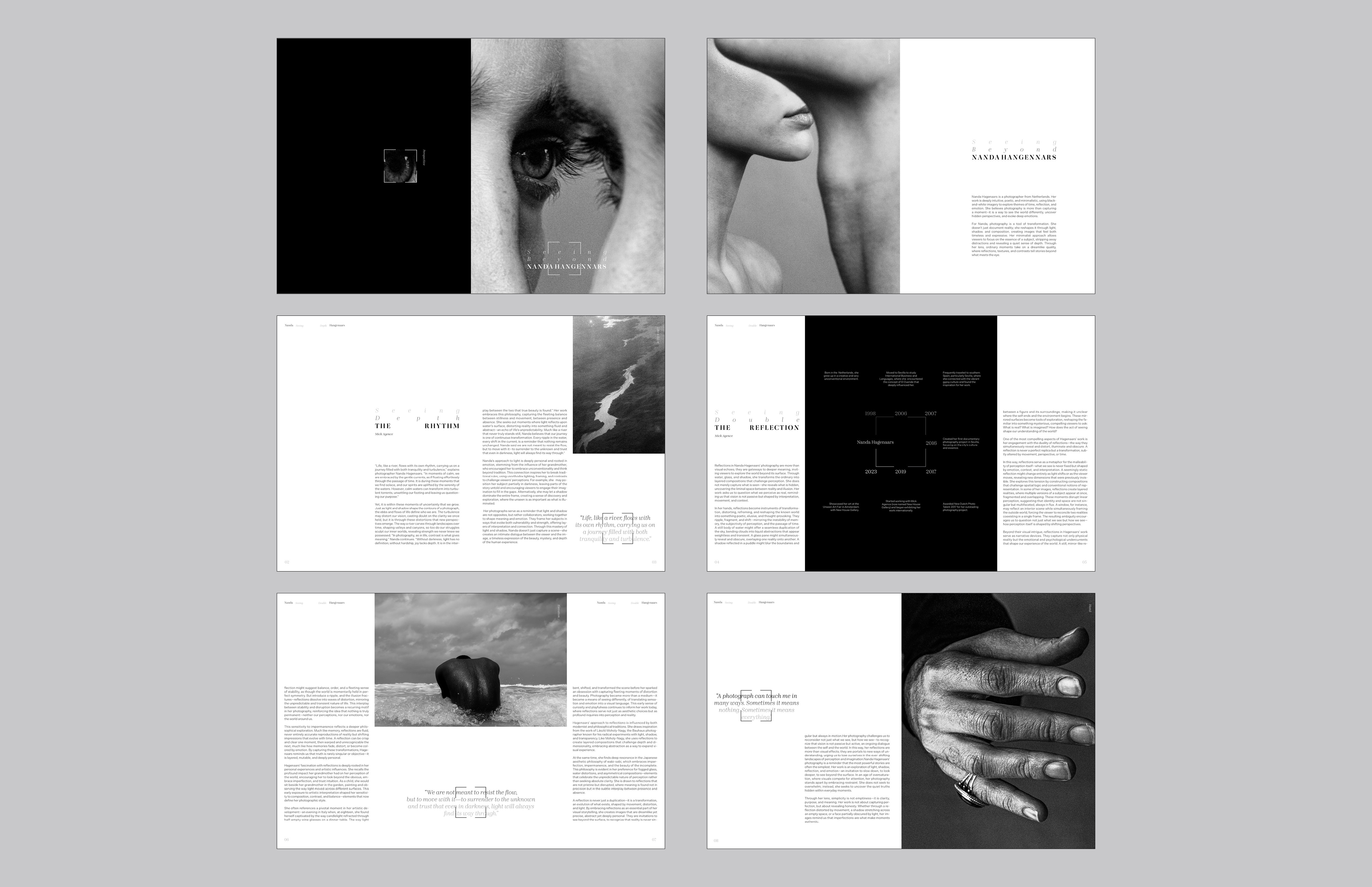 An 8-page booklet introducing Dutch photographer Nanda Hagenaars, whose poetic black-and-white work explores themes of reflection, time, and perception. Through a minimalist typographic layout, the booklet frames her philosophy of seeing beyond surfaces, uncovering emotion and depth in ordinary moments.