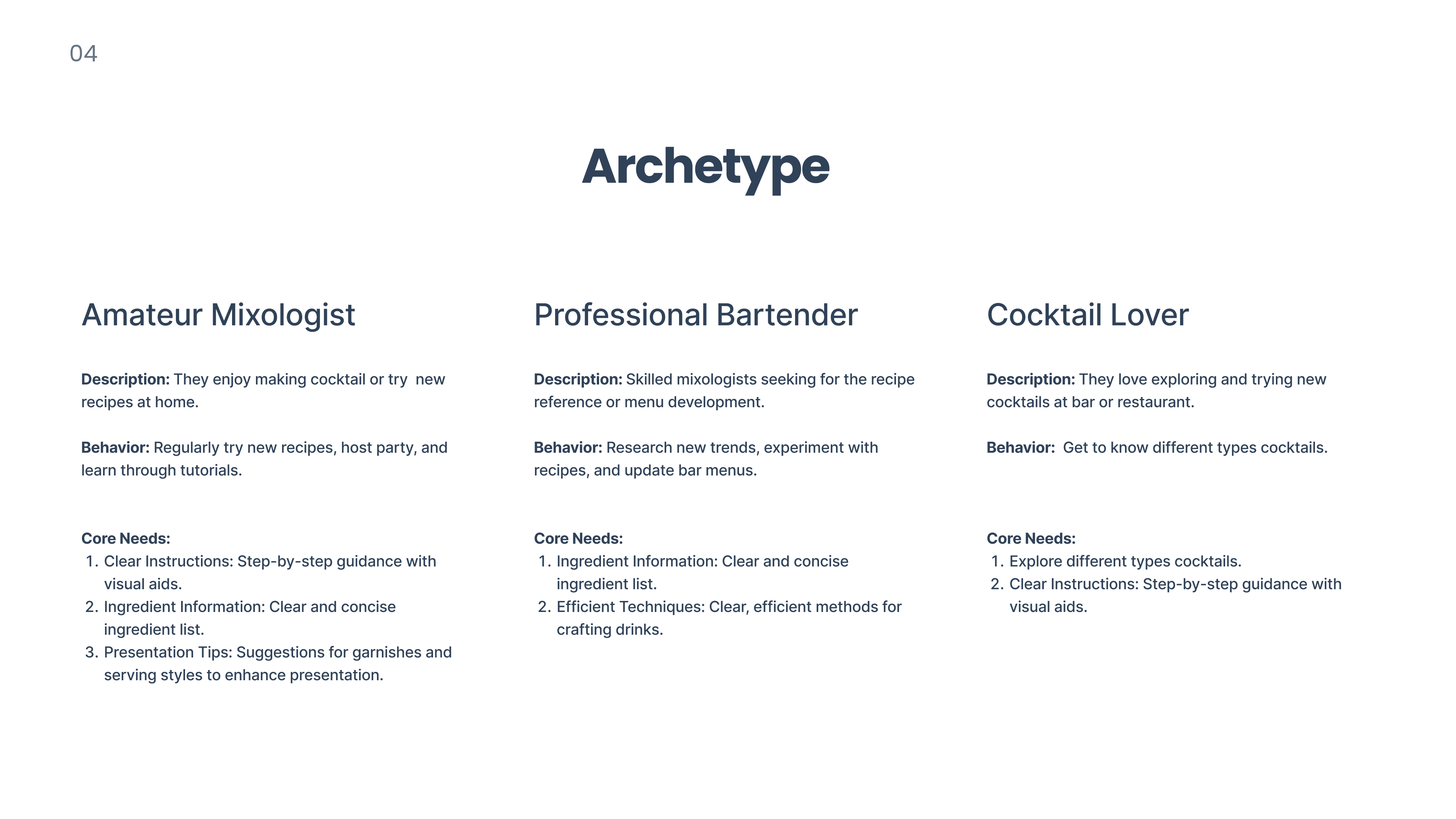 To ground the design, I identified three core archetypes: the Amateur Mixologist, the Professional Bartender, and the Cocktail Lover.