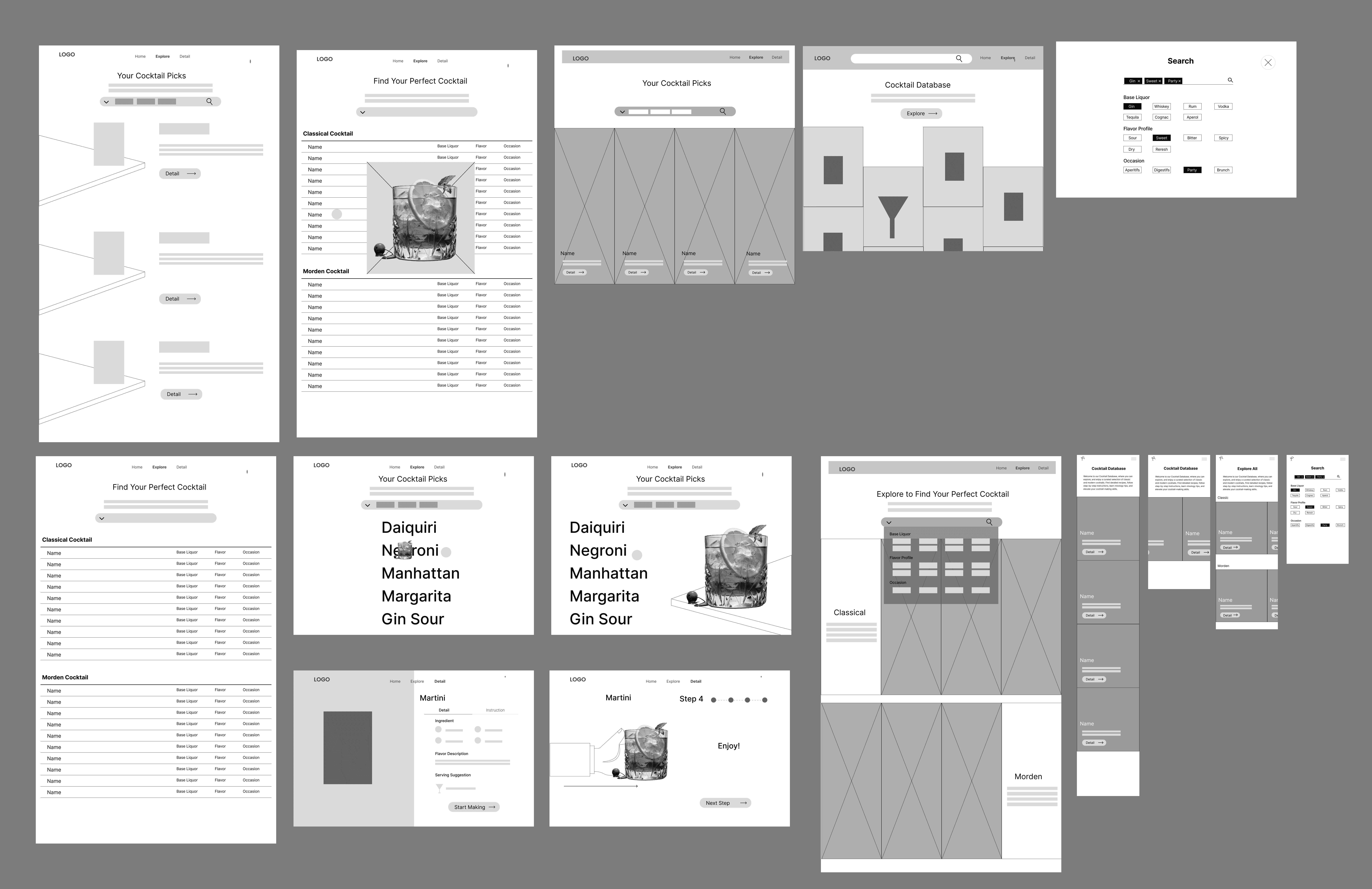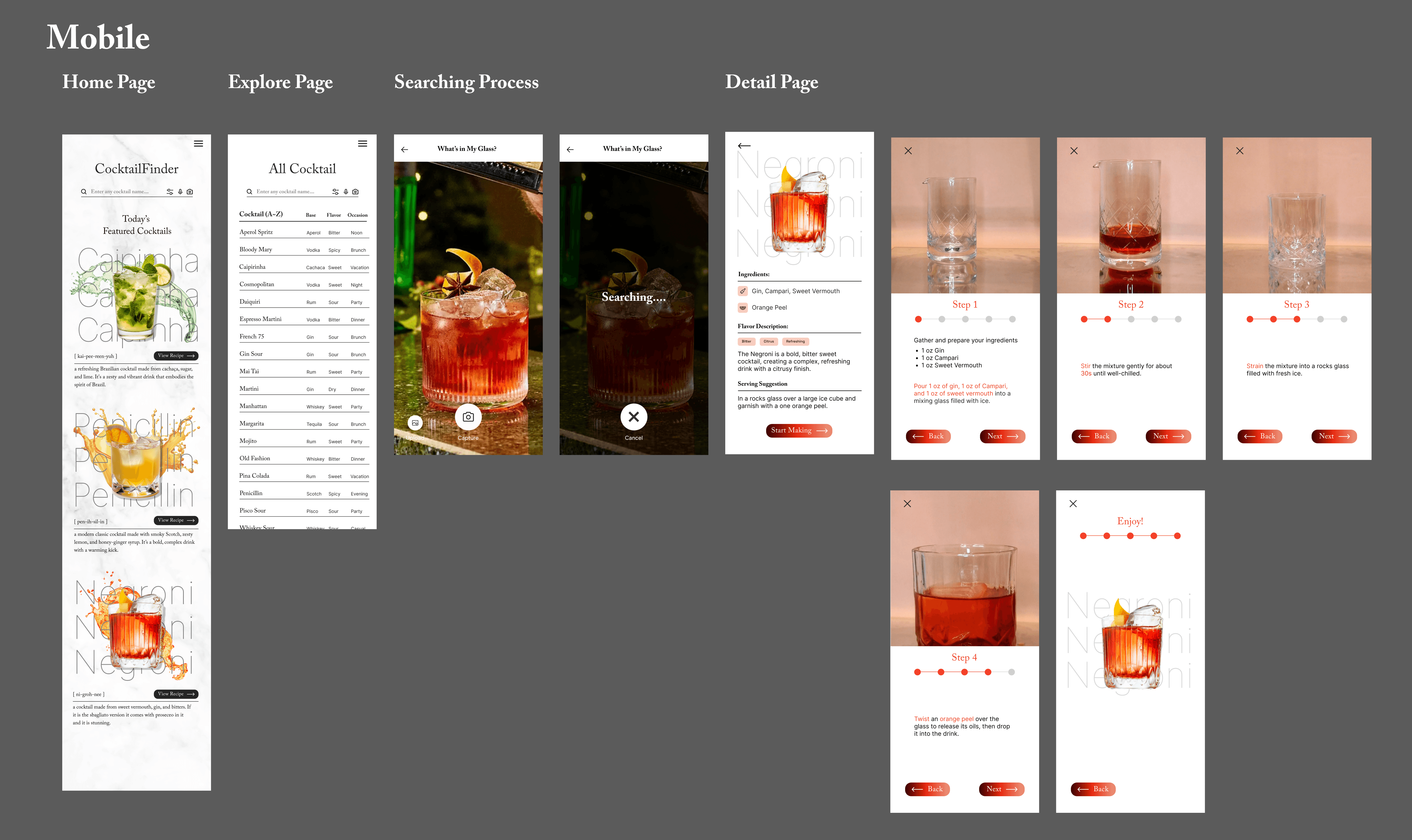 CocktailFinder is a web and mobile prototype that helps users discover cocktails and learn mixology with ease. The project focuses on simplifying the cocktail-making experience through structured information and engaging interactions.