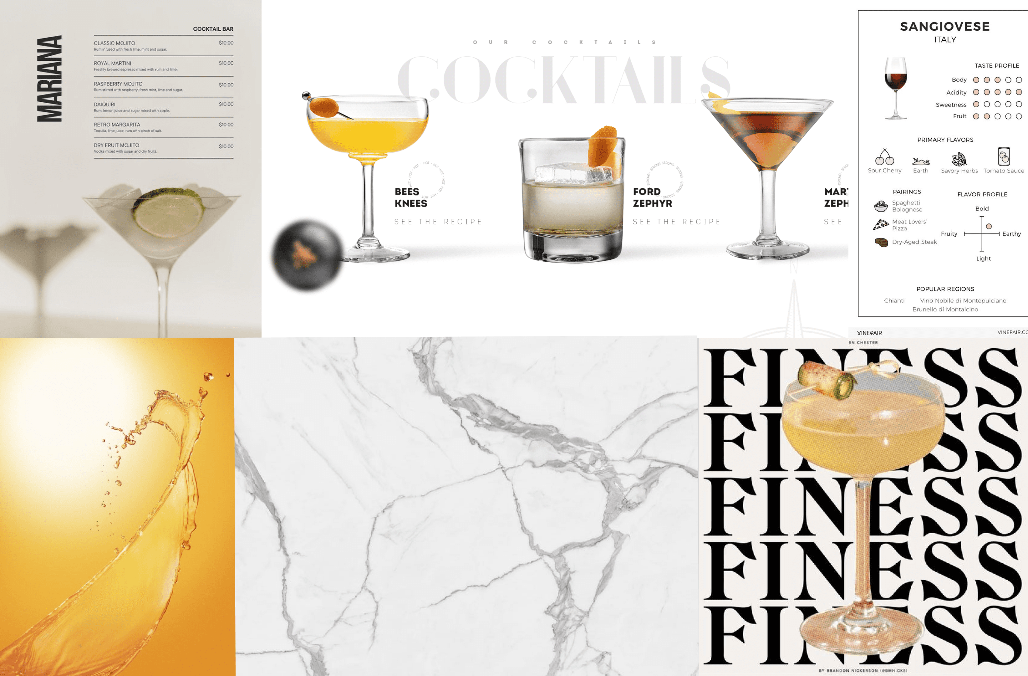 Texture: Neutral marble textures create a refined backdrop where cocktails remain the hero.