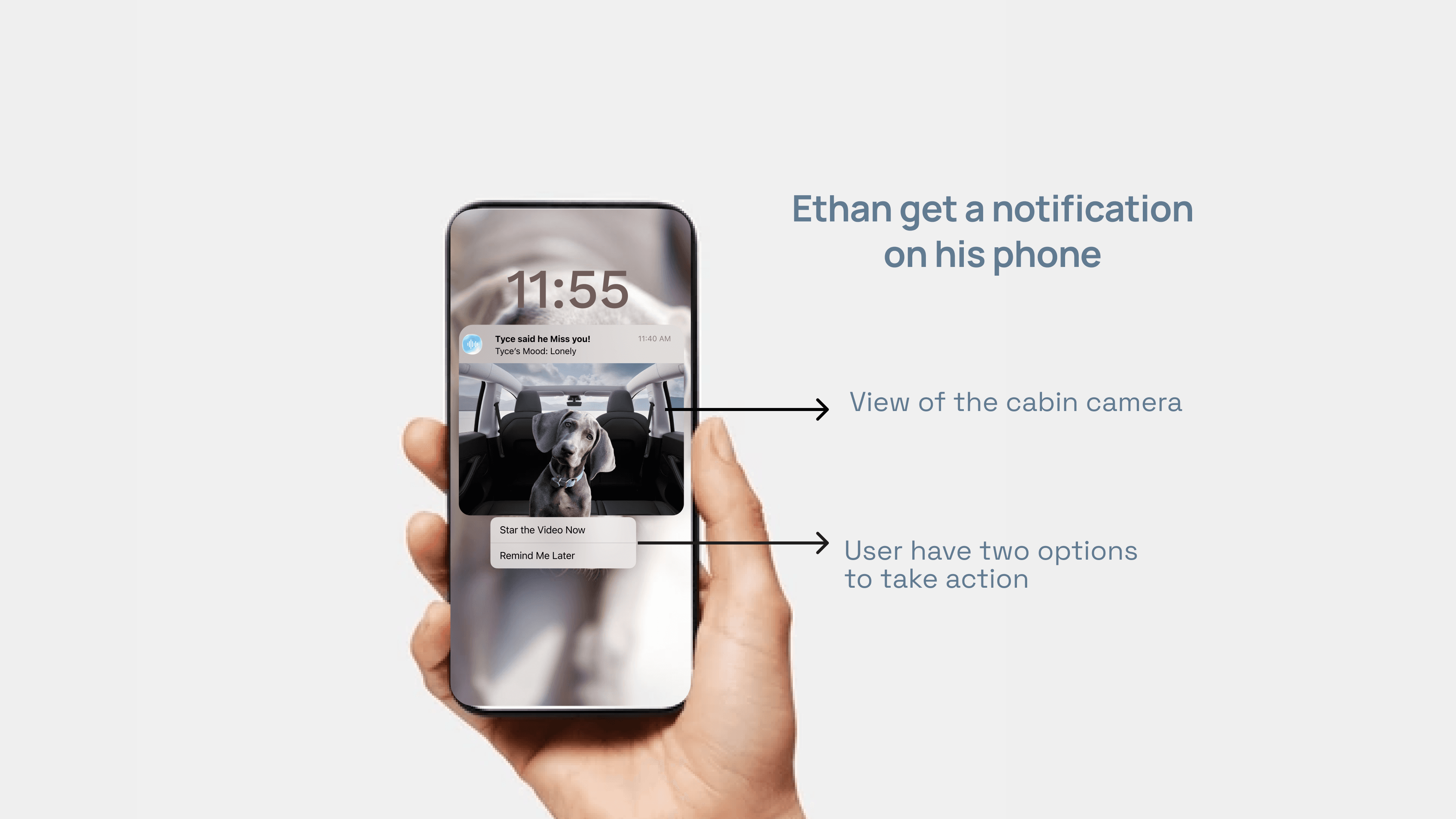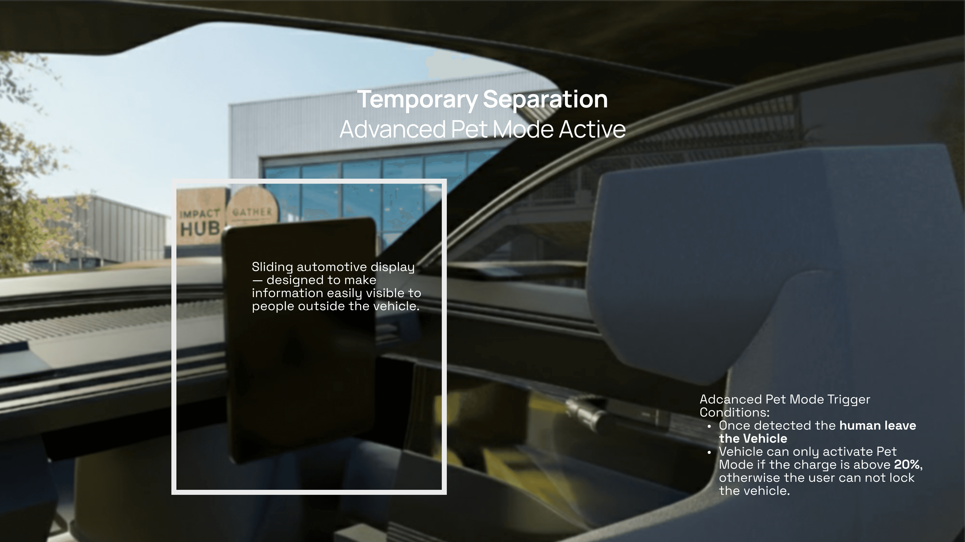 Even though this situation is rare—and ideally should never happen—I pushed myself to design for the worst-case scenario: a pet is left inside the vehicle and their wellbeing becomes at risk. This feature is designed to reduce harm when the owner is unavailable or the vehicle’s comfort system fails.