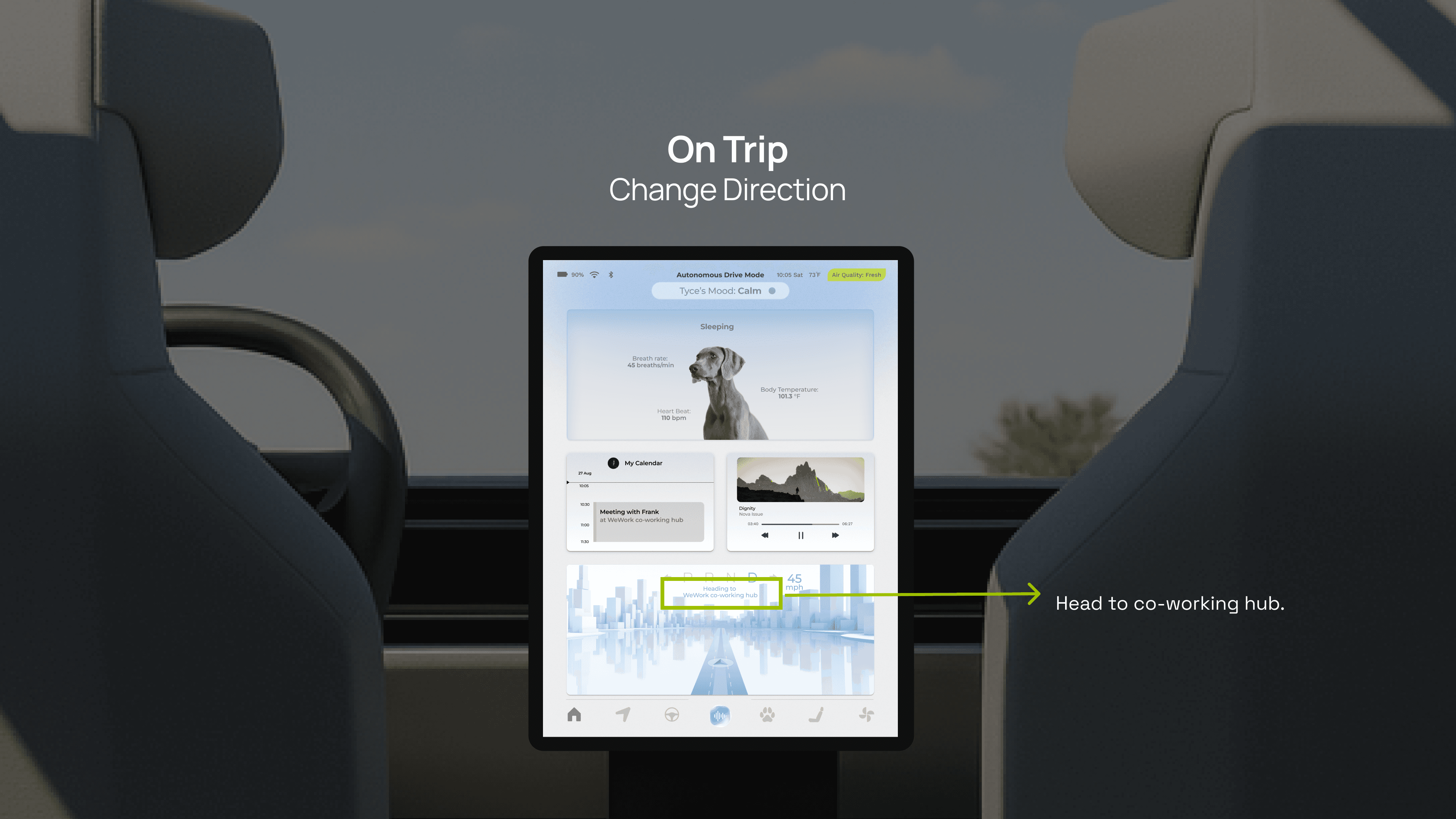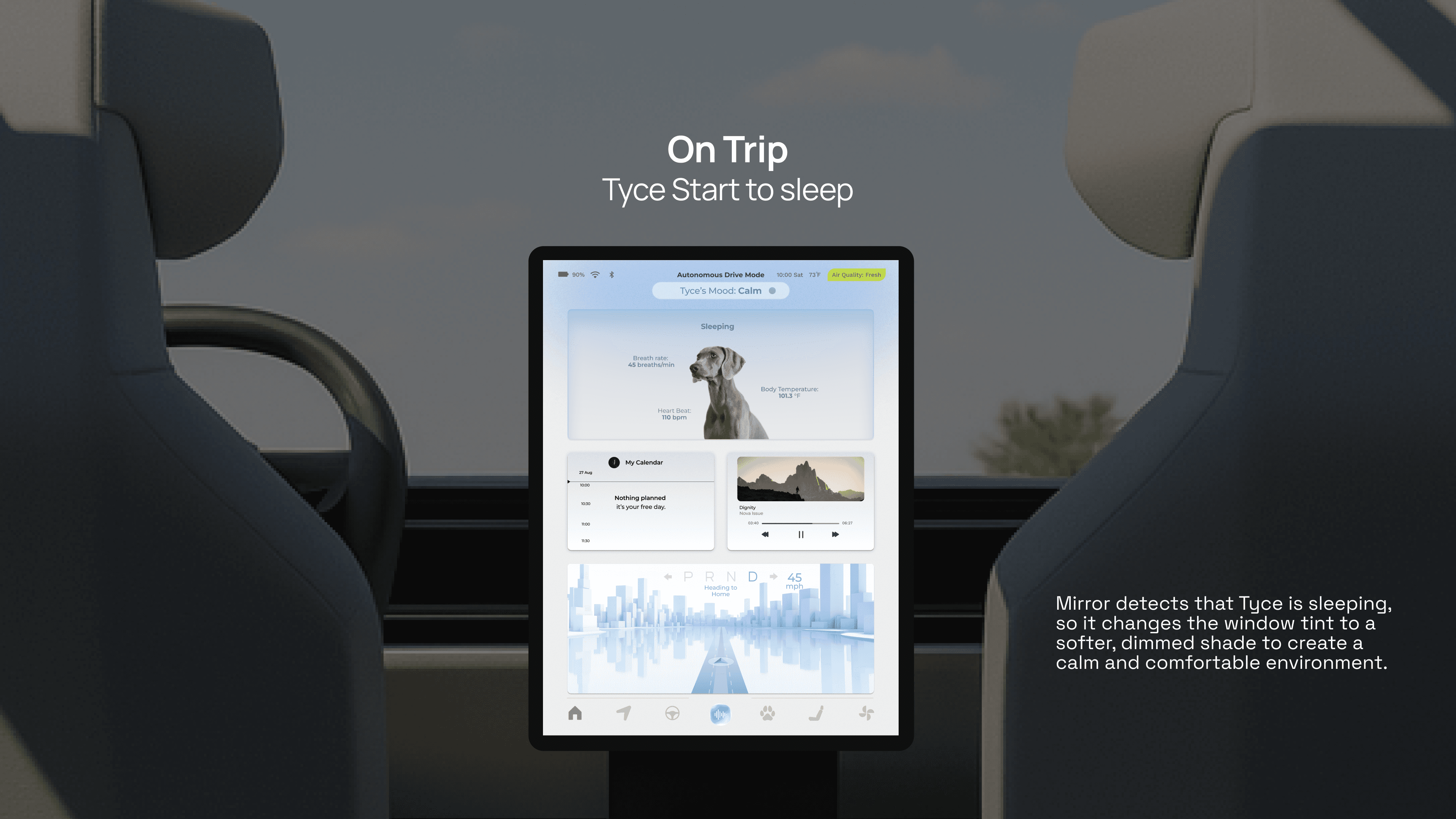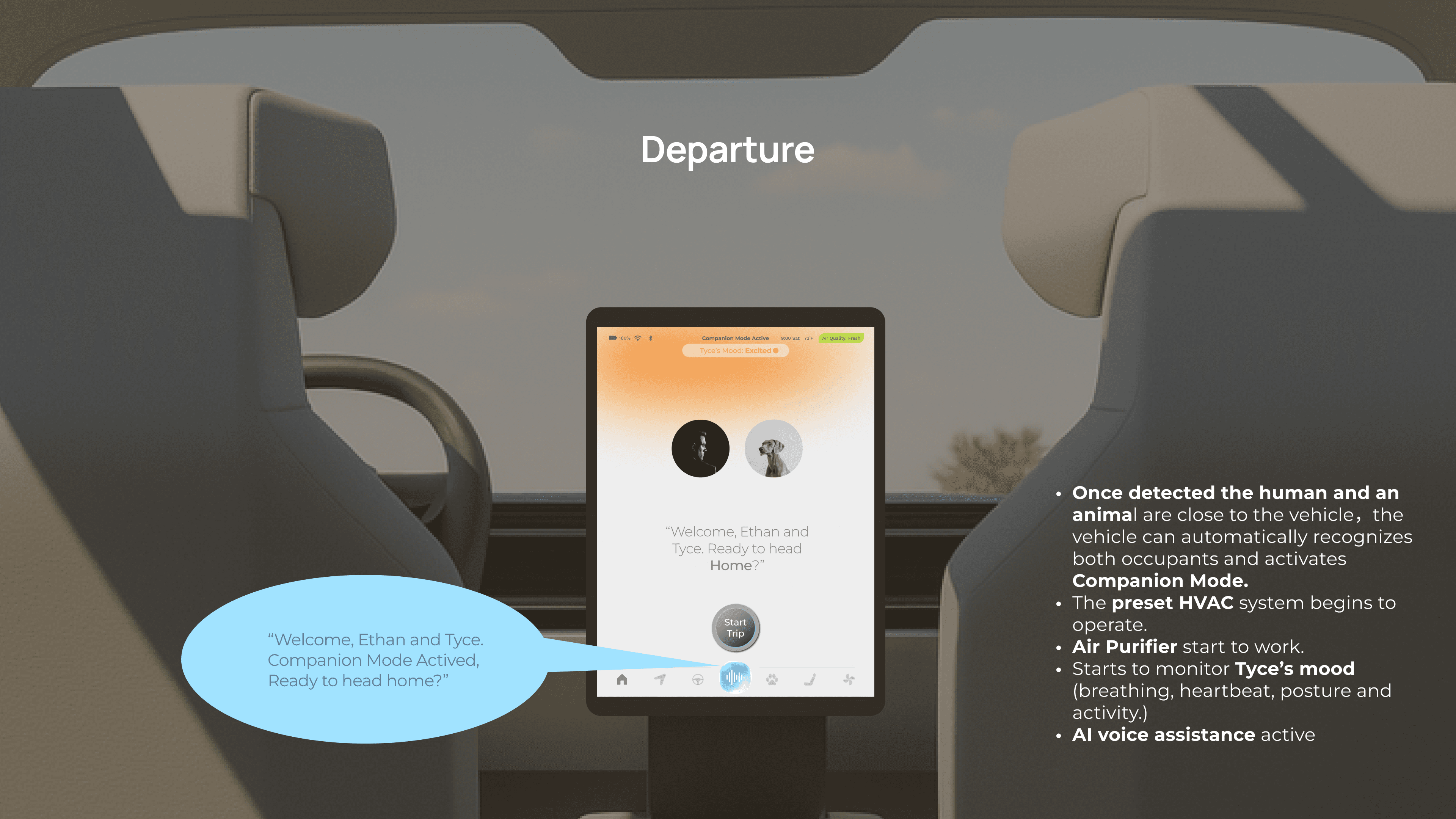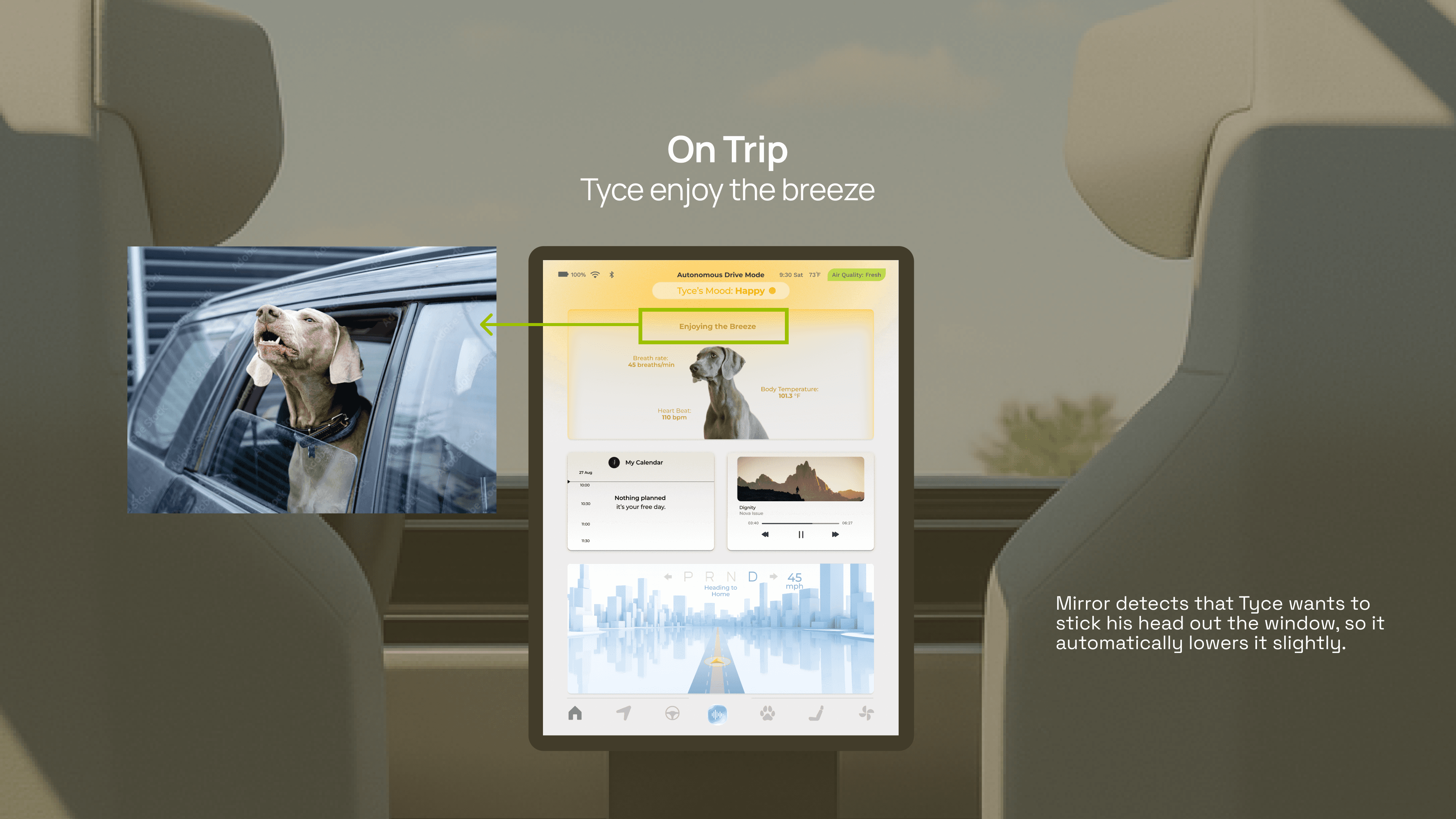 This project envisions a 2035 Level-4 private autonomous vehicle experience that redesigns the relationship between human, vehicle, and companion dog—treating the dog as a real passenger with needs, not cargo. It prototypes a multimodal HMI that supports calm, trust, and smooth transitions from pickup to park arrival.