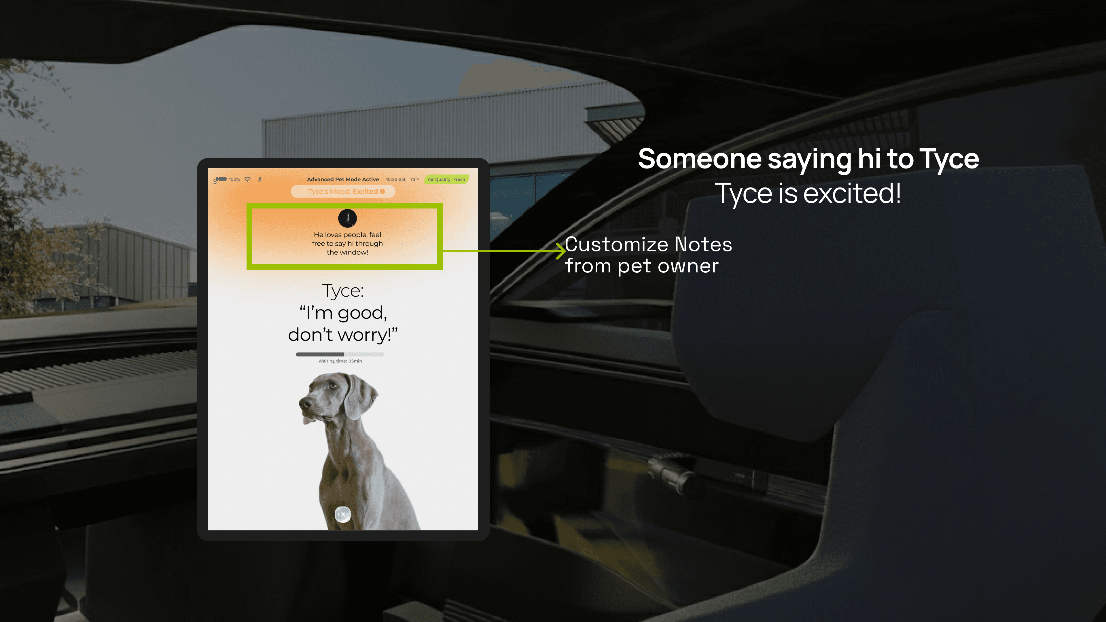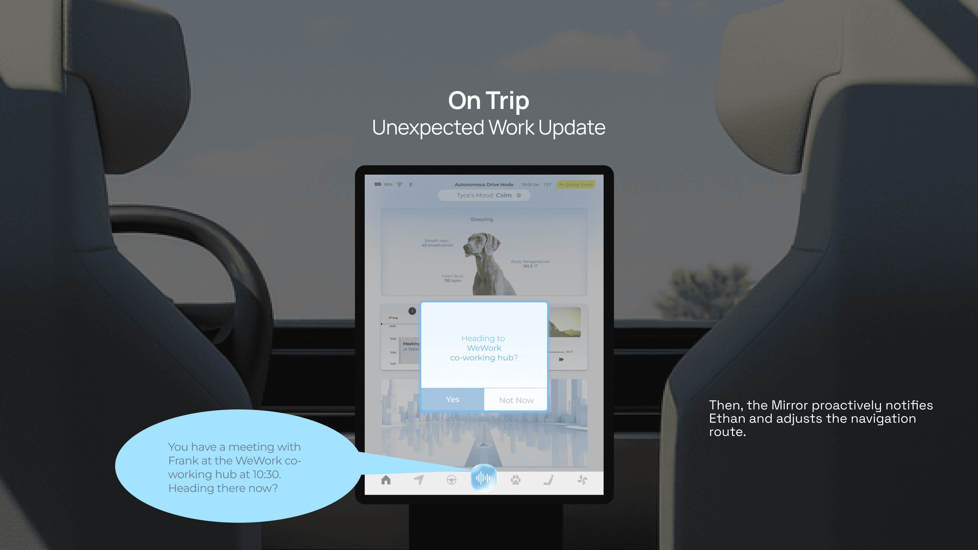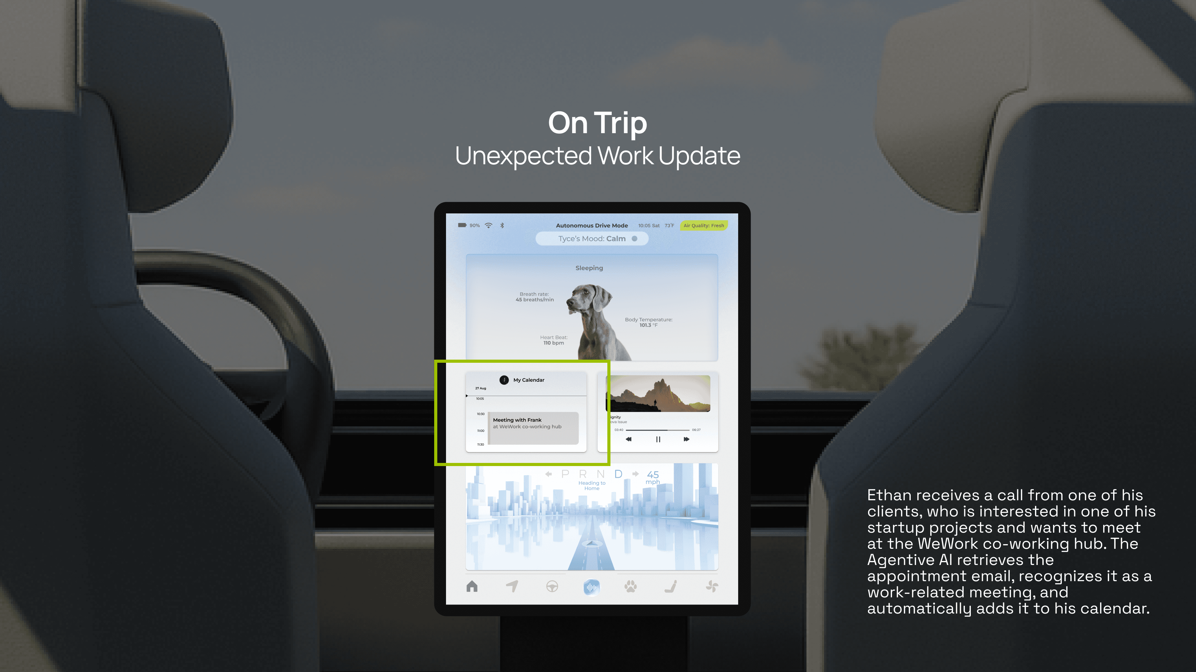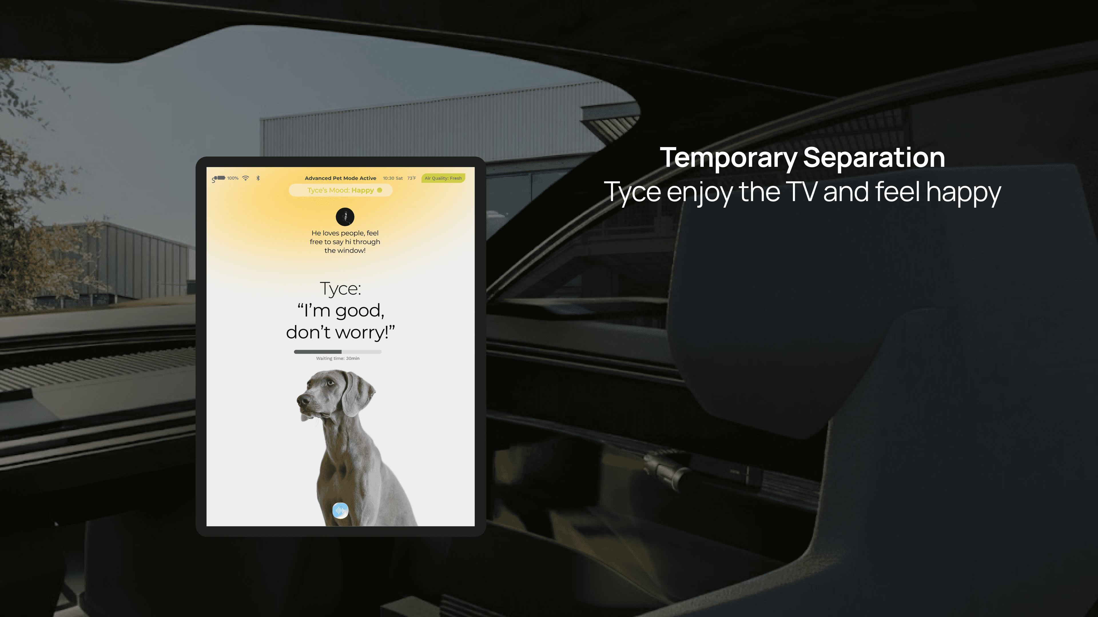 This project envisions a 2035 Level-4 private autonomous vehicle experience that redesigns the relationship between human, vehicle, and companion dog—treating the dog as a real passenger with needs, not cargo. It prototypes a multimodal HMI that supports calm, trust, and smooth transitions from pickup to park arrival.