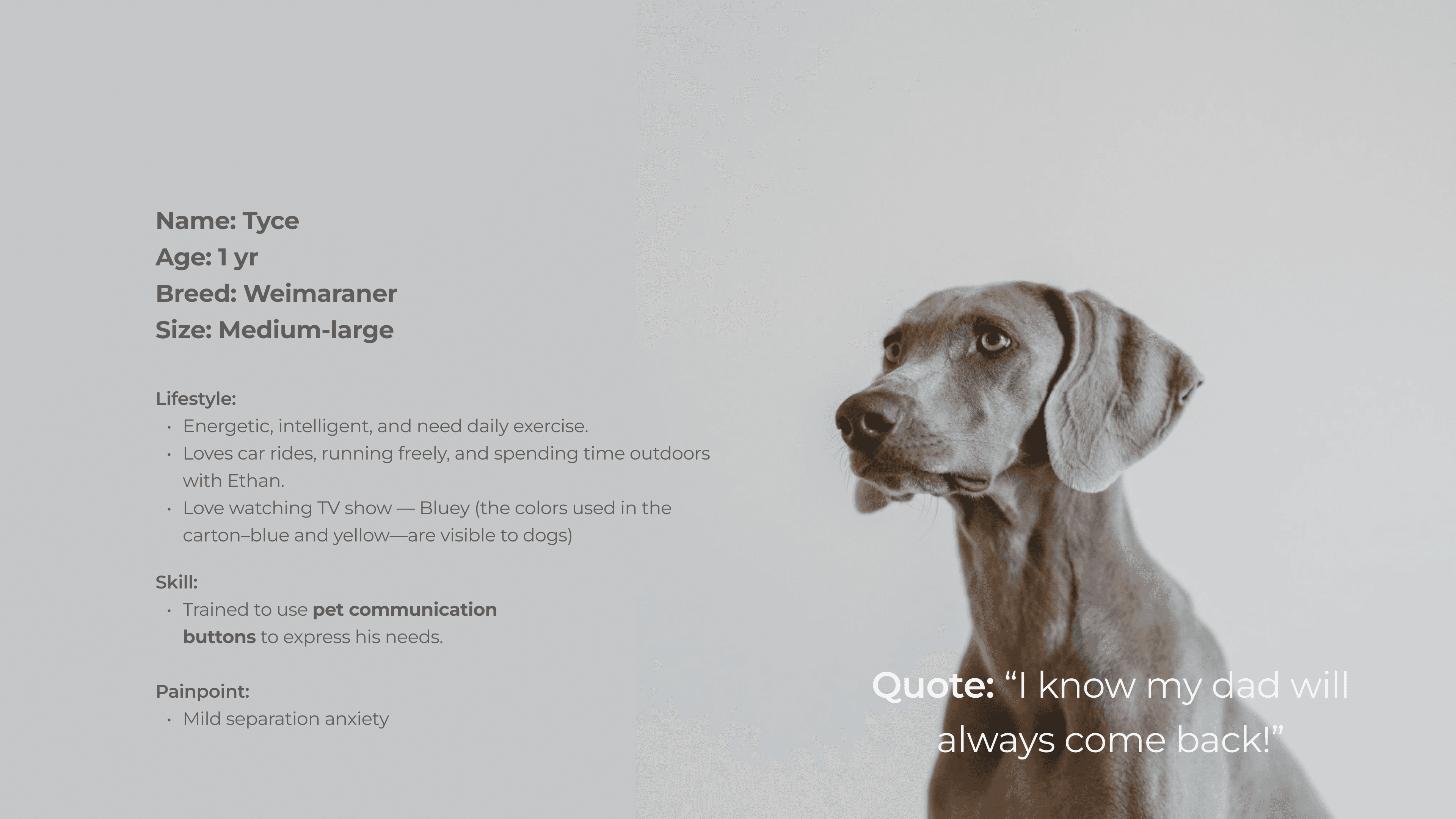 as a designer, my design goal for this project is to ensure pets are safe and comfortable throughout the journey, while reducing pet owners’ stress—both during trips and during short separations (when the owner needs to step away temporarily). I aim to design an experience that builds trust through calm, clear feedback and proactive support for both pet wellbeing and owner peace of mind.